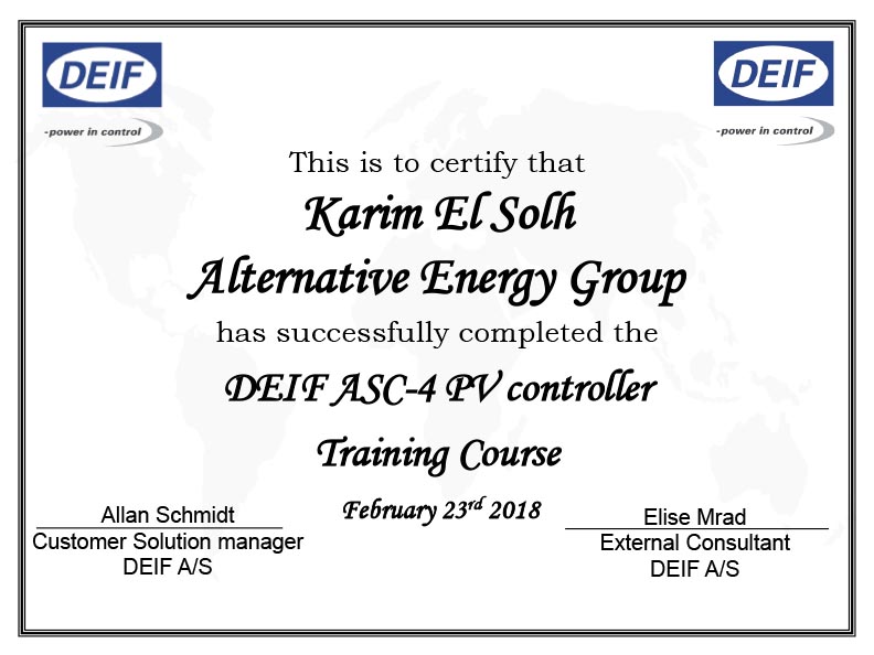 AEG has been successfully completed the Deif ASC-4 PV controller training course on February 23rd 2018.